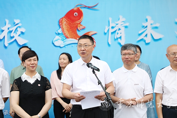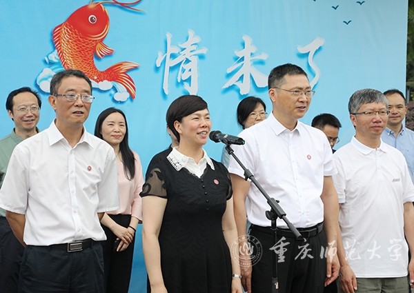 6月25日上午,Beat365官方网站校友会2024年毕业季系列活动之“感恩母校,‘鱼’情未了”鱼苗投放活动举行。学校党委书记张艳、校长王国胤、党委副书记陈志军,副校长杨如安、陆远权、黄永宜、孟小军、付文升出席活动,学校相关职能部门、文学院负责人,1991届化学专业校友、“感动中国·年度人物”胡忠,2024届毕业年级分会常务理事及2024届毕业生代表们共同参与鱼苗投放活动。校长王国胤主持活动。