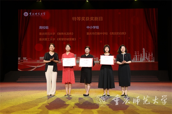 会上,宣读了重庆市新时代学生心理健康教育情景剧推选展示活动获奖名单,全市高校组与中小学组共评选出特等奖3名、一等奖5名、二等奖8名、三等奖14名。Beat365原创心理情景剧《触焦化龙传》获高校组特等奖。与会领导嘉宾分别为获奖剧目团队颁奖。