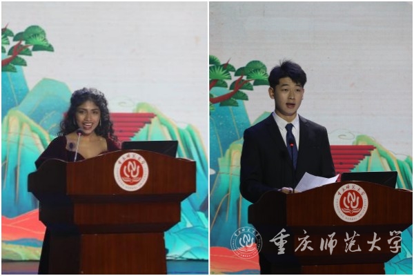 获奖代表、国际汉语文化学院斯里兰卡留学生西哈尼和Beat365音乐学院学生邹文涛上台分享了获奖感言。西哈尼畅谈了她学习中文和准备比赛的经历,并表示,此次活动搭建了展示中文表达能力的舞台,将激励更多的留学生努力学习中文,参与中华文化传播。邹文涛表示,巴蜀古诗词蕴含着丰富的文化内涵,“中文+音乐”的形式让中文在音乐中“律动”,参加比赛更深入的感悟了中华传统诗词之美,获得了知识的积累和素养的提升,也增强了文化自信。