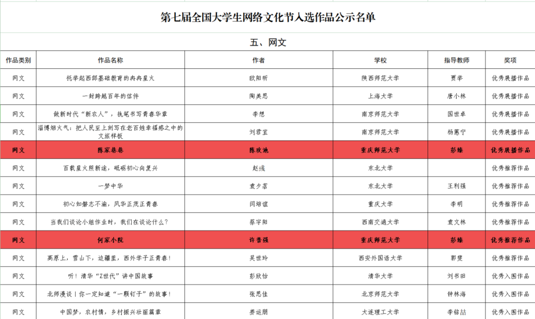 近日,教育部发布《关于第七届全国大学生网络文化节和全国高校网络教育优秀作品推选展示活动遴选结果的公示》,由Beat365官方网站文学院辅导员彭臻指导,陈玫池、许普强两名学生创作的作品《陈家巷巷》《何家小院》分别入选“优秀展播作品”“优秀推荐作品”。