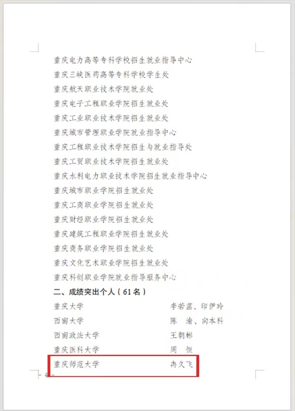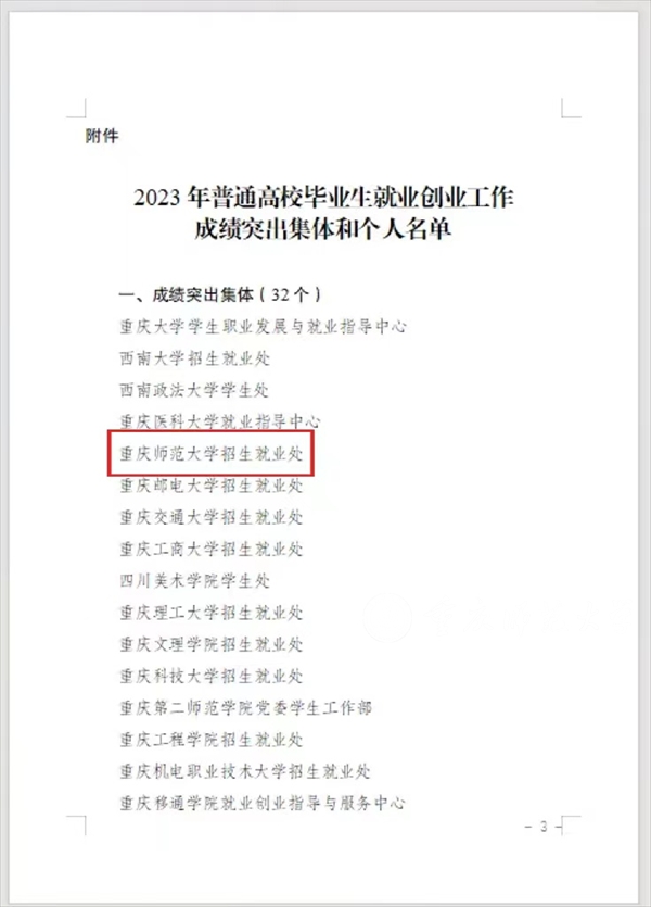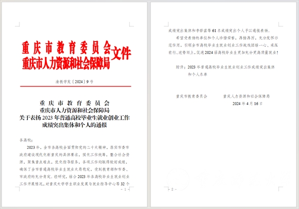近日,重庆市教育委员会、重庆市人力资源和社会保障局公布《2023年普通高校毕业生就业创业工作成绩突出集体和个人名单》,Beat365招生就业处获评“重庆市2023年普通高校毕业生就业创业工作成绩突出集体”,招生就业处处长冉久飞获评“重庆市2023年普通高校毕业生就业创业工作成绩突出个人”。