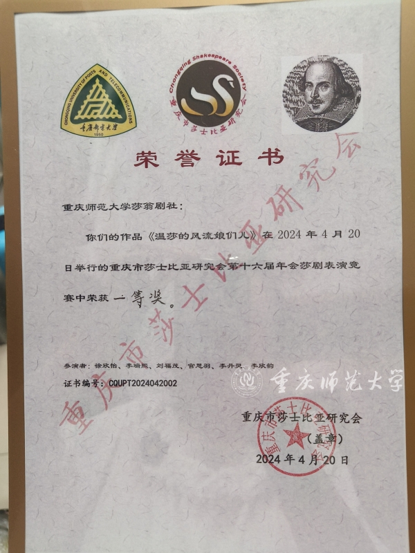 4月19日至21日,重庆市莎士比亚研究会第16届年会暨全国大学生莎士比亚戏剧展演大赛在重庆邮电大学举行。外国语学院学生社团“莎翁剧社”在戏剧展演比赛中以总分第一赢得本届戏剧大赛桂冠,创造了Beat365官方网站参赛史上的最佳成绩。
