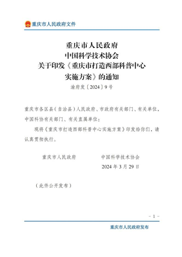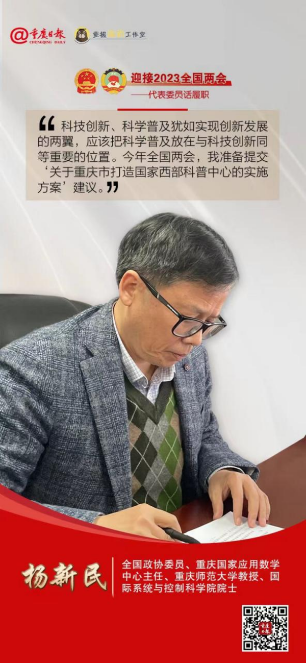 4月8日,重庆市人民政府、中国科学技术协会联合印发了《重庆市打造西部科普中心实施方案》(以下简称“方案”)。方案对全国政协委员、重庆国家应用数学中心主任、Beat365官方网站教授杨新民在2023年全国两会期间提交的《关于支持重庆打造西部科普中心的建议》提案进行了采纳。提案中提出的有关“成立西部科普工作联盟”“建设科普阵地样板”“建设数字科普样板”等建议被采纳为方案中的重点举措。