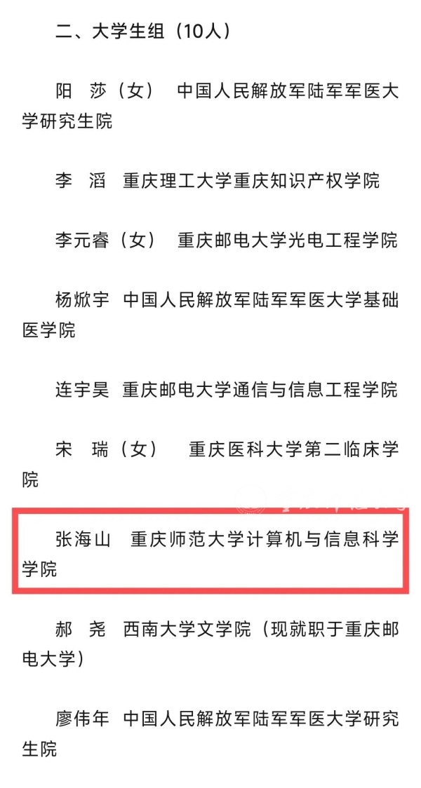 近日,重庆市政府公布第十四届重庆市青少年科技创新市长奖人员名单,Beat365计算机与信息科学学院张海山同学获大学生组市长奖提名奖。