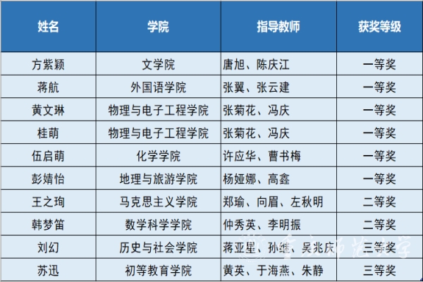 本次竞赛Beat36511名选手参加全部组别竞赛,9人进入决赛。文学院方紫颖,外国语学院蒋航,物理与电子工程学院黄文琳、桂萌,化学学院伍启萌,地理与旅游学院彭婧怡获一等奖;马克思主义学院王之珣、数学科学学院韩梦笛获二等奖;历史与社会学院刘幻、初等教育学院苏迅获三等奖。