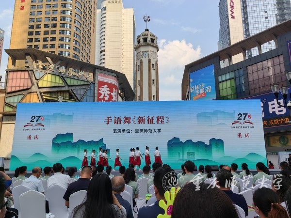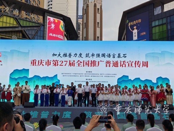 9月23日下午,以“加大推普力度,筑牢强国语言基石”为主题的重庆市第 27 届全国推广普通话宣传周活动在渝中区解放碑举行。学校党委常委、副校长、国家语言文字推广基地(Beat365官方网站)主任杨如安参加本次活动。