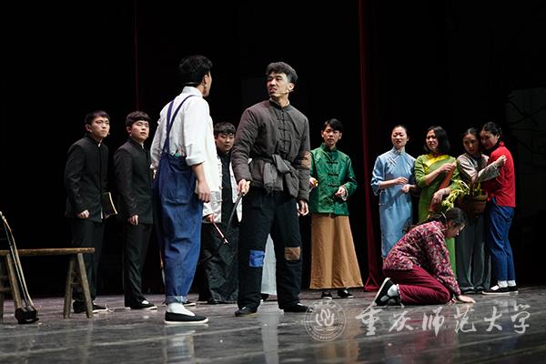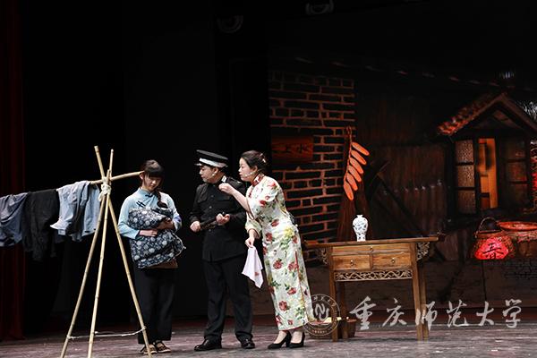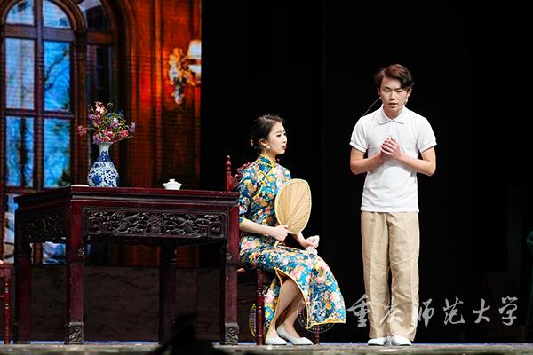 作为当晚五部剧中最受观众期待的《雷雨》,在去年非师范生技能大赛上就深受师生好评。这是剧作家曹禺先生以1925年前后中国社会为背景创作的一个带有浓厚封建色彩的资产阶级家庭的悲剧。本次节选的是繁漪喝药的片段,人物唇枪舌战,剧情紧张压抑。高潮处,在周萍下跪的那一刻,繁漪一口将药闷下去时,全场爆发出热烈的掌声。凭借扣人心弦的剧情和尖锐复杂的冲突,《雷雨》不负期待,再次撼动了全场观众的心。