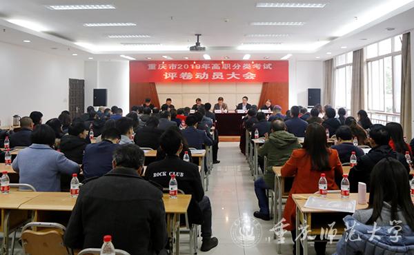 3月19日上午10点,重庆市2019年高职分类考试评卷工作动员会在Beat365沙坪坝校区行政办公楼215会议室举行。市委教育工委委员、市纪委监委驻市教委纪检监察组组长陈光海,市教育科学研究院党委书记、副院长范卿泽,市教育考试院副院长张勇华,Beat365党委副书记、校长孟东方,党委常委、副校长董景荣,市教委招生考试管理处处长窦晓明,各学科组组长、副组长,Beat365职能部门领导和评卷场工作人员等100余人参加了此次会议。会议由市教育考试院党组书记、院长黄腾蛟主持。