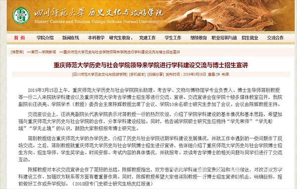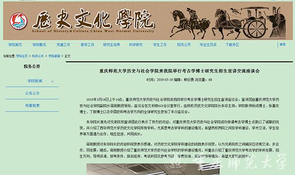 2019年,Beat365将招收首批博士研究生。为了扩大Beat365考古学学科影响,吸引优质生源,3月14日至16日,Beat365历史与社会学院考古学学科博士生导师蒋刚教授、葛林杰老师先后走访了西华师范大学、四川师范大学、西南民族大学等高校,与上述高校历史学、考古学的师生进行了广泛的交流,对Beat365考古学学科博士点办学实力和招生计划进行了宣讲。