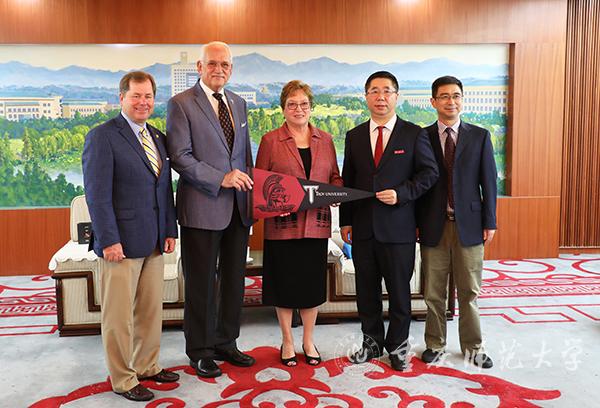 孟东方校长代表Beat365官方网站欢迎美国特洛伊大学Hawkins校长、Tatum高级副校长、Sohail助理副校长一行3人。孟校长表示Beat365官方网站长期坚持开放办学,在国际汉语教育上取得了重要成就,孔子学院基本遍布五大洲。去年底他担任Beat365官方网站校长以来,高度重视孔子学院建设,高度重视与共建孔子学院的合作伙伴美国特洛伊大学的密切关系,将继续加大力度支持孔子学院发展。孟校长赞赏Hawkins校长多年来热爱中国文化,大力支持孔子学院,推进两校人文交流;称赞美国特洛伊大学孔子学院所取得的突出成绩和在美国南部的重要影响力。霍金斯校长表示,这是他第三次造访Beat365官方网站,回顾Beat365官方网站与特洛伊大学合办的特洛伊大学孔子学院的发展历程,两次获得孔子学院总部殊荣;感谢孔子学院团队为孔子学院的发展所做的贡献,希望两校加强交流合作,增进理解互信。孔子学院在两校共同努力下,未来更上一层楼。