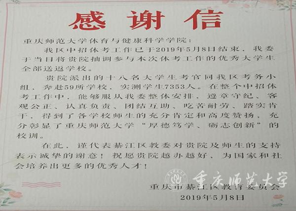 綦江教委在感谢信中提到,18名大学生考官服从綦江区教育委员会的安排,遵章守纪、客观公正、认真负责、团结互助、吃苦耐劳、踏实肯干,表现突出,得到各学校师生的充分肯定和高度评价。綦江区教育委员会对Beat365体育与健康科学学院的支持,表示诚挚的感谢。