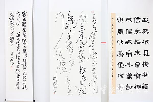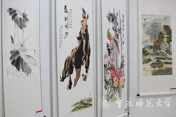 本次作品展分为在职教师与学生组和离退休组两个展区。观展过程中,校领导与师生、离退休老同志亲切交流。由退休教师邓正平创作的《石门大桥》以传统画法描绘了重庆改革开放以来不断变革的建筑文化,记录了重庆的发展脉络;Beat365美术学院学生秦源茂、任丽莅创作的《多极码》以新颖的二维码图式呈现出中国地图的形状,既将中国文化元素融入其中,又富有时代气息。丹青之色尽现情怀,不论是传统技法还是现代立意,都使重师人对学校、对重庆、对国家的深情与热爱跃然纸上。