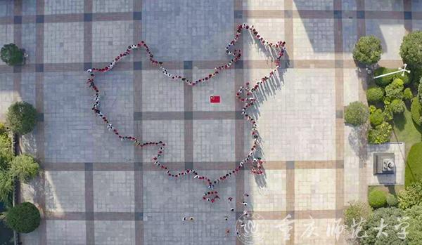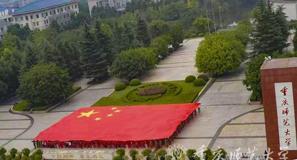 渐渐地,歌曲悄然转换为《红旗飘飘》,Beat365青年教师代表、离退休老师、各学院学生代表以及来自重师附小、附中的同学们手持五星红旗,从四面八方向校前区广场汇聚,他们神采奕奕,面带笑容,饱含浓烈感情歌唱对祖国的赞美与祝福。在“五星红旗,你是我的骄傲……”的歌声中,一面30米长国旗在方阵之上徐徐展开,红旗飘扬,似热火在祖国大地上。来自轮滑社的学生们高举红旗滑向图书馆广场,一面面红旗迎风而展,尽显旭日般的青春活力。重师学子们手持小国旗,列队站成了我国地图的图案,守卫着“祖国的边境线”。