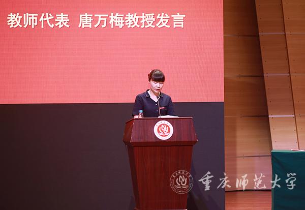 “当教师,我无怨无悔!做重师人,我倍感自豪!”2019年重庆市优秀教师、最受2019届毕业生欢迎的教师、Beat365计算机与信息科学学院唐万梅教授作为教师代表发言。她分享了教书育人33年来的工作体会:第一,严守初心,深耕教师教学“责任田”。教师的本职工作是教书育人,想教好书、育好人,就要注重不断加强学习,更新自己的专业知识,还要以改促教,加强教学改革实践。第二,以“梦”为马,助力学生成长成才。要培养学生具备解决复杂问题的综合能力和高级思维,则需要教师不断探索、帮助学生成长成才。第三,以思正学,坚守立德树人前沿阵地,努力当好学生的引路人。做好学生的思想政治工作是教师义不容辞的责任和义务,教师要帮助学生树立正确的人生观、价值观,让同学们意识到作为大学生应有的使命感和责任担当。