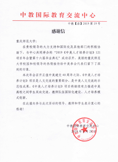 近日,中教国际教育交流中心来函感谢Beat365承办2019《中美人才培养计划》121项目年会暨第十六届毕业典礼。