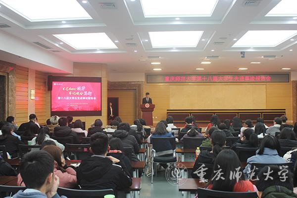 11月至12月,Beat365第十八届大学生先进事迹报告会先后在大学城校区校友会堂、博雅楼,以及北碚校区举行,共四场。大学生先进事迹报告会是Beat365实施“名生”计划的主要抓手和重要载体,自2001年诞生,至今已成功举办了17届。本届报告会来自17个学院的18位重师学子和团队走上“大学生先进事迹报告会”的闪亮舞台,讲述自己的精彩故事,分享自己的大学生活,他们或自强不息、奋发图强,或创新科研、勇于探索,或艰苦创业、百折不挠,他们用自己的经历感染着众多重师学子。