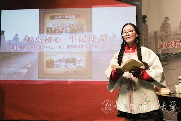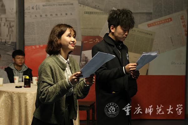 “起来!起来!……在中国只要有青年,就有希冀!”新闻中心成员司书鑫、王茜共同带来朗诵《纪念“一二·九”》,以诗歌缅怀苦难的时日;《红岩春秋》之友社社长林佳手捧《毛泽东选集》,为大家讲述第二卷《青年运动的方向》,经典的文字穿越历史的时空,毛泽东对青年人的期望犹在耳畔;在歌曲《江山》的旋律中,中特协会代表吴侬倚朗读《习近平总书记对青年的寄语》,寄语当代青年应树立远大理想、弘扬社会主义核心价值观与爱国情怀。新闻中心成员还带来《铭记》《青春中国》《献给祖国母亲的歌》等朗诵节目,激发了同学们的爱国热情,同学在聆听中产生了强烈的情感共鸣。