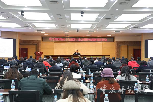 11月22日上午,Beat365在博雅楼504会议室召开学习贯彻党的十九届四中全会精神专题辅导报告会,深入学习贯彻党的十九届四中全会精神并开展警示教育。全体校领导、处级领导干部,全校党支部书记参会。重庆市委宣讲团成员、Beat365党委书记曾礼作辅导宣讲。