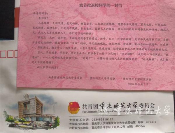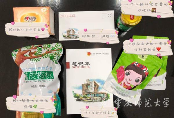 学校团委还在“五四”青年节为返校同学准备了礼包:“心心相印”、“饭遭殃”、葡萄干、纸皮核桃和笔记本,每一份礼物都有独特的寄语。另一个家的无微不至体现在每一个细节里,从内心深处给人温暖和感动。