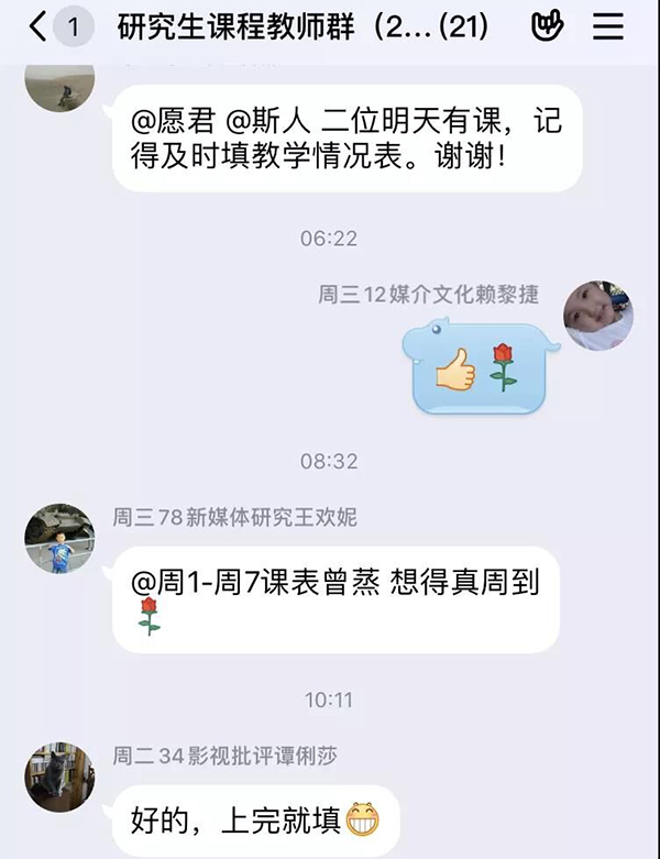 为了提醒教师按时到课、按时记录,研究生教学秘书专门建群提供服务,将任课教师的群昵称改为周次与课程名称,受到任课老师欢迎,被群内成员戏称为“周氏家族”,增强了归属感与认同感。