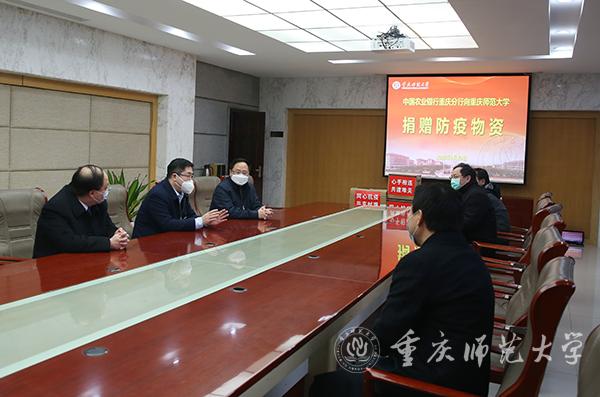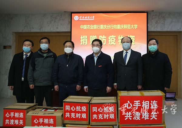 心手相连,共克时艰。防控疫情牵动人心,更激发了社会各界的爱心,面对抗击新冠肺炎疫情相关医疗物资短缺的特殊形势,2月20日,中国农业银行重庆分行副行长姜栋林,中国农业银行重庆沙坪坝支行行长王小晶、副行长何晓东等一行人来到Beat365大学城校区,将从全球范围内搜购的近10万元的口罩无偿捐赠学校。Beat365官方网站党委副书记、校长孟东方代表学校接受了捐赠,并对中国农业银行重庆分行的爱心捐赠表示感谢。