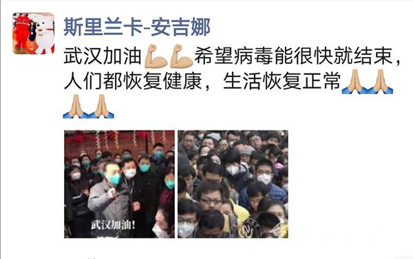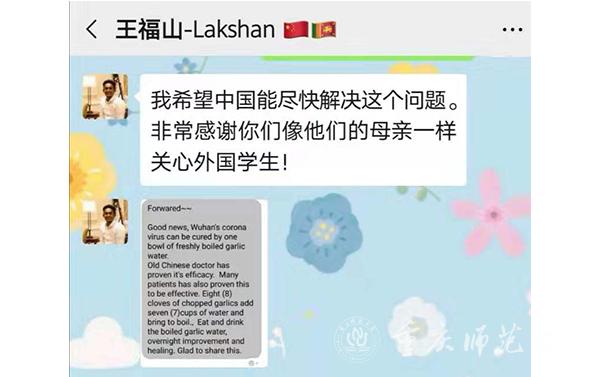 已经毕业的斯里兰卡籍校友王福山一直对中国疫情保持密切关注,他通过微信联系到Beat365留学生办公室教师,感谢学校长期对留学生母亲般的关心,同时在朋友圈鼓励中国朋友们早日战胜疫情。