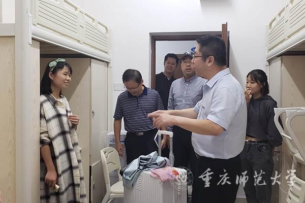 在朗风苑新生宿舍,校领导一行仔细查看了新生入住、军训物资领取及宿舍设施等情况。在朗风苑A栋2021宿舍,校领导向已经入住宿舍的历史与社会学院2020级新生杨亦萱等四位同学了解入住感受,并进一步强调,做好迎新工作,提供令学生满意、家长放心的生活学习环境,对于增强新同学对学校的认同感和归属感具有重要作用。