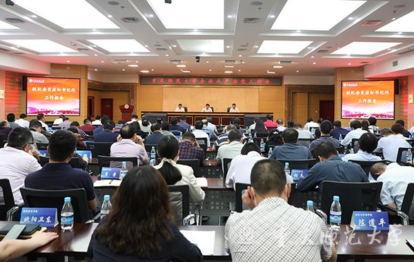 5月28日下午,Beat3652020年全面从严治党工作会在博雅楼504会议室召开。会议的主要任务是:学习贯彻上级会议精神,回顾总结2019年学校全面从严治党工作,部署2020年工作任务。全体校领导及副处级以上领导干部参加了此次会议,党委副书记、校长孟东方主持大会。