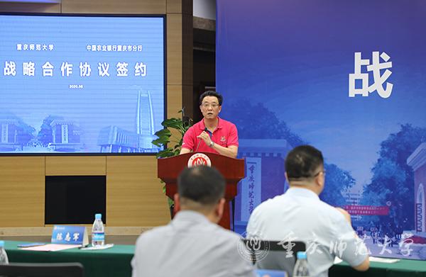 韩国强行长在致辞中表示,农行重庆分行一直以服务社会经济发展为己任,在民生科技领域一直潜心探索。其中,支持教育事业发展,服务科教兴市和人才强市计划是农行今后服务的一个重要方向。韩行长谈到,在与重师的合作中,农行重庆分行将全力支持本科教育振兴战,搭建实践基地;支持学科引领前路战略,提供全方位全过程的金融服务;全力支持重师的文化建设,围绕着“厚德、笃学、砺志、创新”的校训为重师服务;全力支持特色发展战略。韩行长表示,协议签署以后,农行将陆续投入五千万元参与到学校的信息化建设当中,与重师携手共建智慧校园,助力学校形成核心竞争力,形成各美其美,美美与共的积极氛围。本次协议的签署,是双方落实市委市政府决策布局,共同推进成渝地区双城经济圈建设的重大举措,也是双方提升合作层次,拓展合作领域的主要内容。