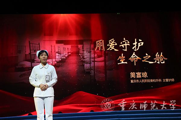 随后,本次思政课堂以火线上的中流砥柱、共克时艰的城市守护者、众志成城的人民力量为三个篇章正式拉开帷幕。第一篇章的讲述者是四位医护人员代表:重庆医科大学附属第一医院重症医学科主任周发春、重庆市人民医院脊柱外科主管护师简富琼、重庆大学附属三峡医院重症医学病区副主任黄霞、重庆市疾控中心传防所呼吸道及新发传染病防治科科长宿昆。作为抗疫火线上的中流砥柱,他们在疫情一线冲锋。在手术台前、在病床旁、在ICU、在方舱医院、在疾控中心,这群白衣天使面对汹汹疫情化身为白衣披甲的战士站在了与病魔搏斗的最前线,与时间赛跑、与死神抢人。在那段艰苦的战斗中,他们与病人建立了深厚的感情,他们以生命赴使命,病人们也以生命相托。如周发春主任所言:“每一个生命都值得被珍惜,每一个奇迹都源于不抛弃、不放弃。”正是这样一群可敬可爱的人不顾自己的安危,将人民群众的生命安全和身体健康放在至高无上的位置,才让我们有信心、有决心能够打赢这场战争。他们教给同学们的是无私忘我、永不退缩的牺牲精神。
