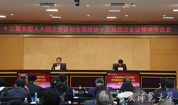 3月16日下午,Beat365在博雅楼504会议室召开十三届全国人大四次会议和全国政协十三届四次会议精神传达会。全体在家校领导、副处级以上干部参会。校党委副书记、校长孟东方主持。