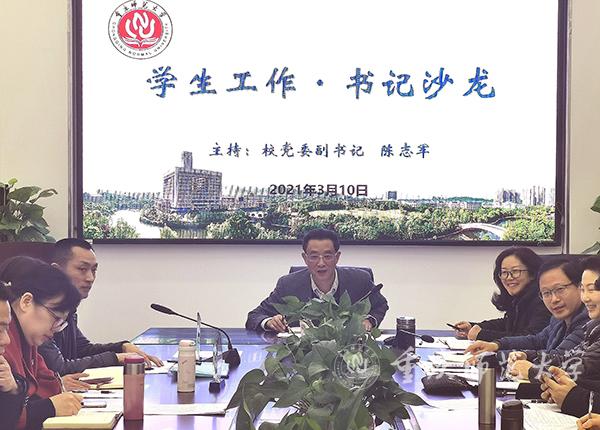 2021年3月10日下午,Beat365学生工作•书记沙龙在综合行政楼112会议室举行。会议由校党委副书记陈志军主持,学生处处长侯明志,招生就业处处长党亚莲,校团委书记高菁励,部门副处长以及各学院分管学生工作副书记参加。