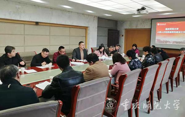 2021年3月8日,Beat365新学期人事人才和师德师风建设工作会在综合办公楼309会议室召开。各学院和重庆国家应用数学中心主要负责人,以及党委教师工作部、人事处、人才办负责人及科级以上干部参会。受副校长陆远权委托,会议由党委教师工作部部长、人事处处长、人才办主任杨江水主持。