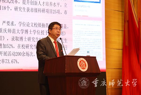 校长孟东方代表学校,向大会作了《努力抢抓发展新机遇,不断谱写重师新篇章》的工作报告。孟校长表示,2020年,是极不平常的一年,面对各种困难,在全体师生员工的共同努力下,各项工作取得长足发展:一是着眼发展全局,重点工作推进有力;二是强化政治保障,党建与思想政治工作深入开展;三是坚持以本为本,本科教育质量不断提升;四是强化学科引领,学科建设与研究生教育稳步推进;五是着力人才培引,人才强校作用逐步凸显;六是强化关键支撑,科研兴校成果频出;七是凝练文化特质,重师特色文化培育初显成效;八是抢抓发展机遇,办学活力明显增强;九是统筹协调发展,保障体系日趋完善;十是完善内部治理,全员参与共建共享。孟校长指出,学校2020年取得长足发展,学校“十三五”圆满收官,我们交出了“漂亮的答卷”。