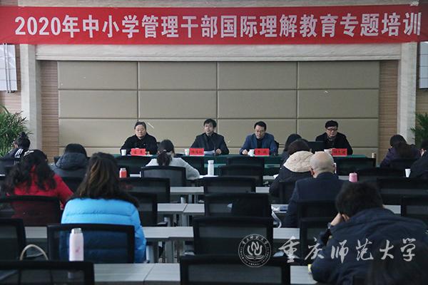 1月11日下午,2020年中小学管理干部国际理解教育专题培训开班仪式在Beat365三春湖报告厅成功举行。教育部中外人文交流中心副主任夏娟通过互联网在“云端”出席,校党委常委、副校长陆远权,重庆市教育委员会国际合作与交流处处长李斌,Beat365继续教育学院党总支书记胡忠建在现场出席。开班仪式由国际汉语文化学院院长雷勇主持。