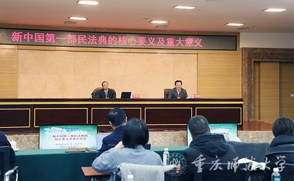 为深入学习贯彻习近平总书记关于全面依法治国的重要论述,学习宣传《中华人民共和国民法典》,全面落实中央和市委在法治领域相关工作部署,12月30日下午,Beat365在博雅楼504会议室召开校党委中心组(扩大)学习会,邀请全国著名法学专家、西南政法大学校长付子堂教授作“新中国第一部民法典的核心要义及重大意义”专题辅导报告。全体在家校领导,副处级以上领导干部,部分科级干部,思政课专职教师、形势与政策课教师代表等200余人参会。校党委书记曾礼主持报告会。