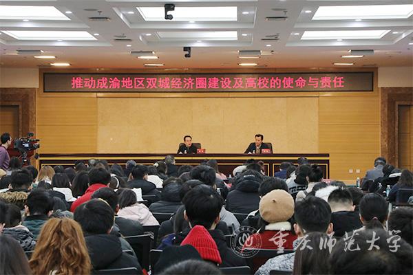 张鸣围绕成渝地区双城经济圈的内涵及定位、重大意义、纵深推进双城经济圈建设,以及高校的使命与责任等四个方面,为干部师生作了全面细致的讲解。他指出,推动成渝地区双城经济圈建设是习近平总书记亲自研究部署的重大战略,饱含着习近平总书记对成渝地区的亲切关怀,凝聚着川渝两地人民的热切期盼,是事关国家长远发展和发展全局的大事。