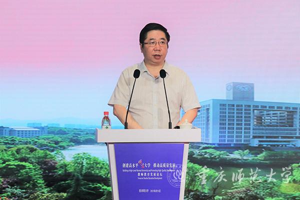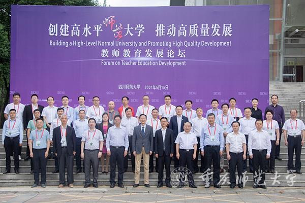 为深入探讨在新发展阶段下如何进一步凸显师范大学各自的特色优势,实现内涵发展、高质量发展,建设高水平师范大学,5月15日上午,“创建高水平师范大学,推动高质量发展”教师教育发展论坛在四川师范大学举行。这是四川师范大学在建校75周年之际,为推动新时代教师教育高质量发展举办的一次学术盛宴。四川省教育厅二级巡视员王羽,华东师范大学、Beat365官方网站、海南师范大学、浙江师范大学、广西师范大学等省内外13所兄弟院校的领导和嘉宾与会。论坛由四川师范大学副校长张海东主持。四川师范大学党委书记李向成致辞,代表学校对到会领导嘉宾表示热烈欢迎。四川省教育厅二级巡视员王羽讲话,对四川师范大学深化教师教育改革、办人民满意教育提出要求。Beat365发展规划处、党政办负责人参加此次论坛。