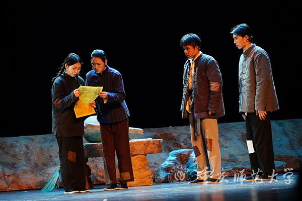 《宣言》剧本创作者之一、女主角姜若兰的饰演者,文学院2017级戏剧影视文学专业的何谐表示,《宣言》展现的是从建党初期艰难困苦的探索到不断壮大的农民革命力量、从浴血鏖战的抗日战争到摧枯拉朽的人民解放战争,是一部生动鲜活的红色党史。作为戏剧影视文学专业的学子,在这条“一切为了人民,一切源于人民”的文艺创作道路上还有很长的路要走,她今后会做一名更加坚定的革命文化的传播者、创作者。文学院2019级戏剧影视文学专业的肖洋在剧中饰演了男主角刘永才,他表示,刘永才这个形象是无数革命烈士的缩影、是黑暗的旧世界中一株明亮的火苗,他被革命烈士们甘愿牺牲的高尚情怀深深感动。他相信,话剧这种艺术形式能够启发更多青年学生承担新时代使命,积极投身到社会主义建设伟大事业中。