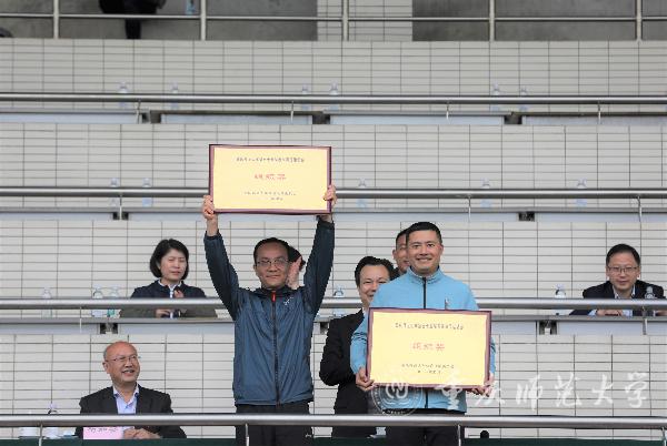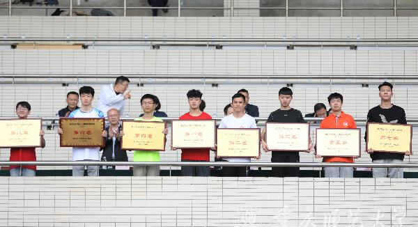 颁奖仪式中,校领导依次为获奖团体和单位颁奖。主持人陈进东主任对取得佳绩的单位和个人表示了衷心祝贺。他表示,希望全体师生继续燃烧运动的激情,加强身体锻炼,把本届运动会上团结奋斗、顽强拼搏、乐观向上、锐意进取的精神发扬光大,把体育运动中的坚强意志、冲天干劲运用到今后的工作和学习中去,取得更加优异的成绩。