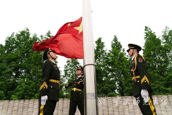 在庄严的国歌声中,五星红旗冉冉升起,迎风飘扬。全场肃立,面向国旗行注目礼。