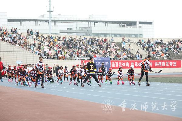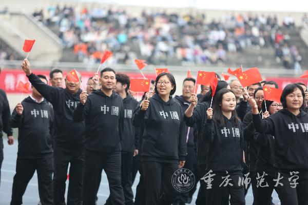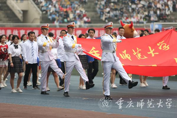 26个风格各异的方阵,26支满腔热忱的队伍。作为赛会的公平使者,裁判员方阵率先出场,全场掌声雷动。各学院方阵独出心裁,精彩纷呈。马克思主义学院将方阵变换出党旗图样进入会场,以建党100周年和党史学习教育主题诗朗诵掷地有声,队员们用红黄两色手花不断变化出重师校训、办学理念、“三名四气”文化特质等内容,标有“红船精神”“抗疫精神”等字样的15面旗帜穿梭其中,立体党徽的压轴亮相把会场气氛推向高潮。“有爱友善,同心同德”,化学学院表演方阵的口号妙趣横生,由不同化学元素的谐音组成,展现了化院人钻坚研微、驰骋赛场的别样风采。敲起大鼓、舞动大红绸缎,历史与社会学院表演方阵喜庆欢快的秧歌别具风味。匕首操、武术、健美操……热血沸腾的专业技能表演展示出体育与健康科学学院的精气神。音乐学院在《我的祖国》歌舞表演中融入党史学习教育主题说唱,奏响青春活力的重师之声。附属学校方阵首次在校运会中亮相,开朗活泼的小朋友们踩着轮滑帅气入场,一张张稚气童真的笑脸赢得全场观众的热烈欢呼。至此,入场式环节告一段落。