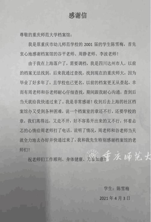 近日,Beat365档案馆收到了一封毕业校友陈雪梅寄来的感谢信。信中,陈雪梅对档案馆的谷平老师、周静老师和李波老师帮助她落户上海的档案调度工作表示由衷感谢。多年来,Beat365档案馆工作人员收到的感谢信不计其数,大多由毕业校友们从五湖四海寄来。