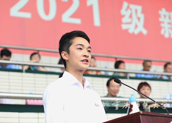 高年级学生代表、美术学院2018级环境设计专业陈俊霖同学发言。他谈到,良好的开端是成功的一半,要敢于走出自己的舒适圈,去大胆尝试;也不要害怕大学过得简单,点点滴滴的坚守更能铸就成功。人生非坦途,同学们要拿出信心、勇气和毅力去迎接大学成才之路的洗礼。