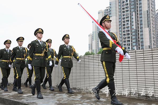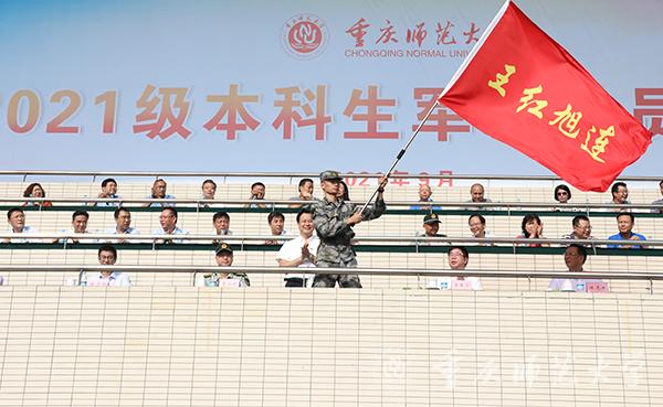 校党委副书记、2021级军训师副政委陈志军宣布2021年学生军训师建制暨任职命令。校党委书记、2021级军训师政委曾礼为军训师二团三十二连——即王红旭连授旗,连长龚文杰同志接旗。