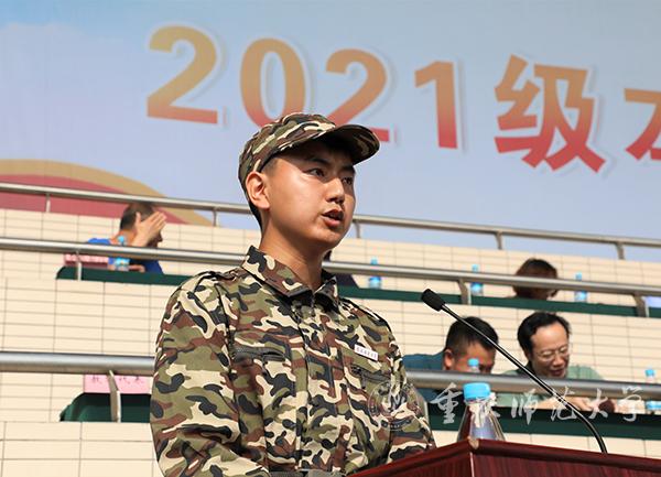 数学科学学院2021级数学与应用数学专业郭洋同学代表受训学员表决心,他表示,军训期间将听从指挥、遵守纪律、认真训练、不怕辛苦、锻炼意志、增强体魄,以优异成绩完成开学第一课。陆军工程大学通信士官学校滕琛代表承训部队教官承诺:“必将在军训师的正确领导下,严守法规纪律,科学组织施训,严格管理,抓好防疫保安全,高标准完成军训任务。”