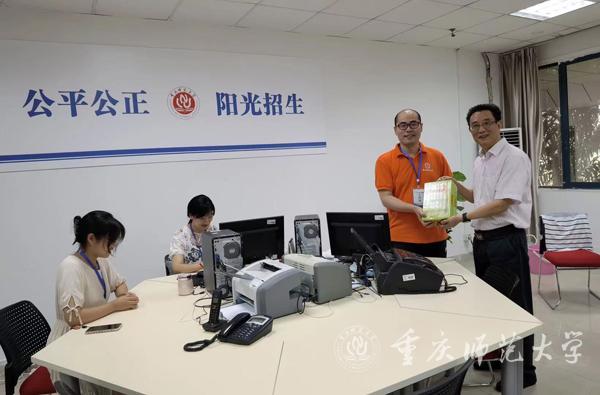 陈志军副书记代表学校向录取和安保工作人员赠送了防暑降温饮品,对全体工作人员在暑期高温的情况下坚守在工作岗位进行2021级新生录取工作表达了感谢,并叮嘱工作人员们要劳逸结合,将党史学习教育融入到录取工作中,发挥共产党员的先锋模范作用,为广大考生和家长解好疑、服好务。招生就业处处长党亚莲向陈志军副书记汇报了学校目前的高考录取情况和工作进度。
