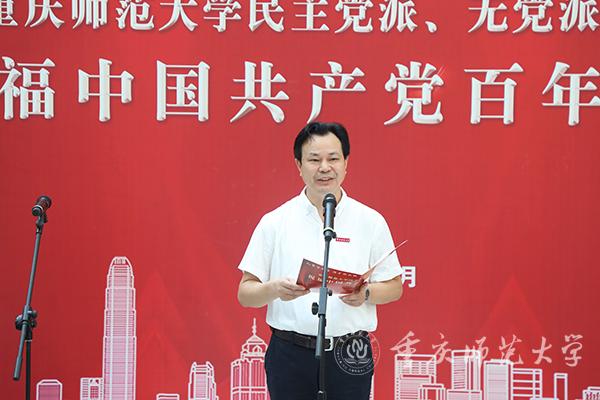 为庆祝中国共产党成立100周年,激励广大统一战线成员不忘合作初心、继续携手前进,7月13日上午,“礼赞百年路·携手新征程——Beat365官方网站民主党派、无党派人士祝福中国共产党百年华诞”活动在校友会堂大厅隆重举行。校党委书记曾礼出席活动并讲话,副校长、农工民主党沙坪坝区委会主委田盈等各民主党派及无党派人士代表、校统一战线工作领导小组成员以及各二级党组织书记出席活动。