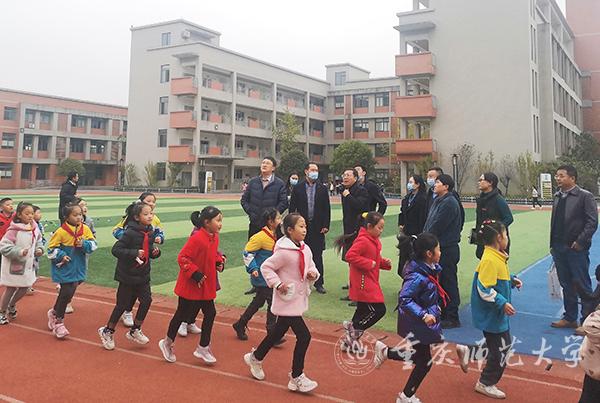 在附属实验小学,孟小军副校长听取了附小校长郑霖开学以来的工作汇报。郑校长以“双减暨五项管理”落实的特色教育教学为亮点,以专家进校、夯实教学教研为重点汇报了近两月工作的常态化、特色化、内涵化发展情况。外联中心付长波主任肯定了附小半学期以来的工作,希望附小利用好基础教育研究院专家资源,深入思考育人课题,持续关注教师成长,建设优质教师队伍。孟小军副校长对附小发展提出嘱托与要求,在双减政策执行的大背景下,要从积淀下来的丰富教育教学实践经验出发,探索卓有成效的育人方式,把准教育教学的研究方向,让学校发展方向准、定力足,以建设重庆市一流乃至全国一流学校为目标,再上新台阶。孟小军副校长特别关心了解了附小教师队伍建设。他指出,教师是学校发展的中坚力量,各方应集聚资源打造完善的教师成长体系和机制,利用专家资源一对一制定教师成长计划并指导,在手把手的帮助下传递爱心、责任与担当。
