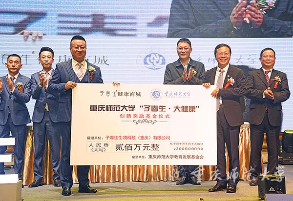捐赠仪式上,子春生生物科技(重庆)有限公司顾问、重庆市政协原秘书长周群致辞。Beat365对外联络与合作中心主任、教育发展基金会副理事长付长波与子春生健康商城CEO赵锴代表双方签署捐赠200万的“子春生·大健康”创新奖励基金协议。